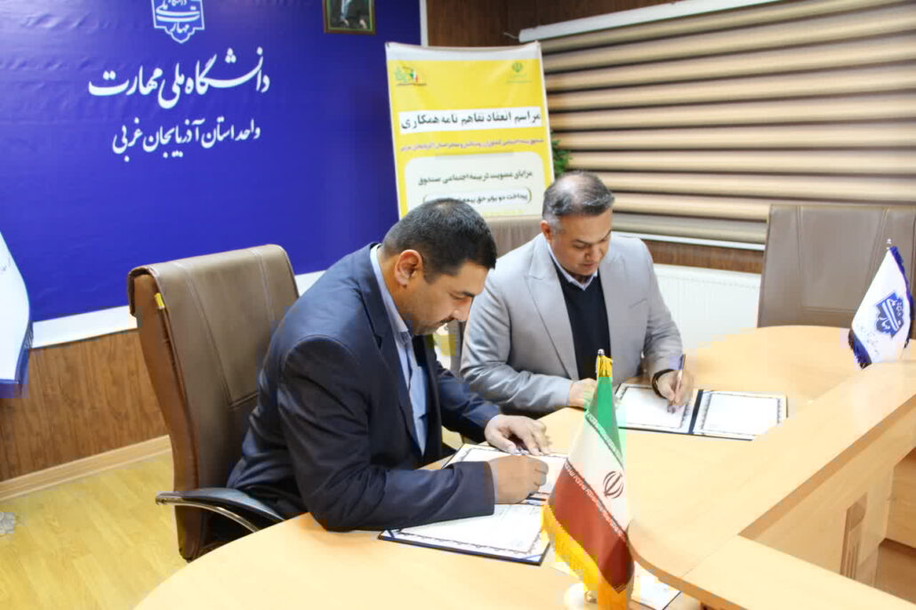 به گزارش روابط عمومی دانشگاه ملی مهارت استان آذربایجان غربی، تفاهمنامه همکاری این دانشگاه و اداره کل صندوق بیمه اجتماعی کشاورزان، روستائیان و عشایر استان، روز دوشنبه ۱۷ آذر ماه با حضور دکتر سید وحید معصومینیا رئیس دانشگاه و مهندس یوسف رحیمی سرپرست اداره کل بیمه، با هدف ایجاد هم افزایی و بهره گیری از ظرفیتهای مشترک و امکانات طرفین در جهت رشد و توسعه شاخصهای اجتماعی دو مجموعه امضا شد.